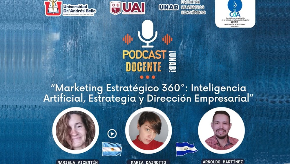 La Universidad Nacional Dr. Andrés Bello de El Salvador (UNAB) lanzó un nuevo episodio de su Podcast Docente en el que participaron las docentes de la Sede Rosario de la Universidad Abierta Interamericana (UAI), Mariela Visentín y María Florencia Dainotto, junto al docente salvadoreño de la UNAB, Arnoldo Martínez. En este capítulo, las especialistas de la Facultad de Ciencias Económicas analizaron en profundidad cómo el Marketing Estratégico 360° y la Inteligencia Artificial (IA) están transformando la competitividad empresarial y la manera de planificar y ejecutar campañas.